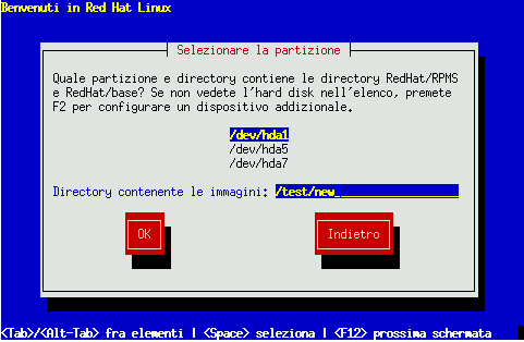 Inserite il nome del dispositivo con la partizione in cui è contenuta l'immagine ISO di Red Hat. Esiste un campo chiamato Directory contenente le immagini. Se le immagini ISO non si trovano nella directory root di questa partizione, inserite il percorso esatto per arrivare alle immagini ISO (per esempio se si trovano in /test/new/RedHat, dovete digitare /test/new).