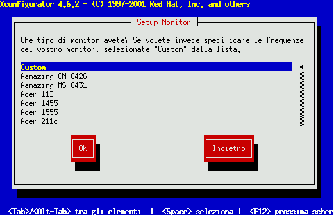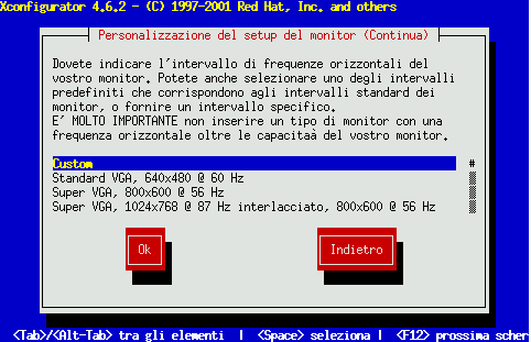 Se selezionate Custom, Xconfigurator vi richiede di selezionare i range di frequenze orizzontali e verticali (questi valori di solito sono disponibili nella documentazione del monitor).