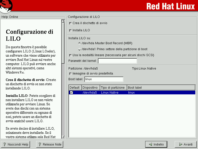 Per poter avviare Red Hat Linux è necessario installare LILO (LInuxLOader). LILO può essere installato in una delle due posizioni seguenti: