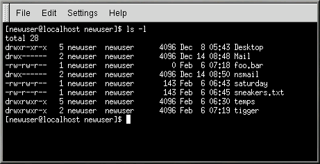 The file's owner (in this case, newuser) has permission to read and write to the file. It is not a program, so newuser doesn't have permission to execute it. The group, newuser, has permission to read and write to sneakers.txt, as well. Similar to the program notation for owner newuser, there's no execute permission for group newuser.