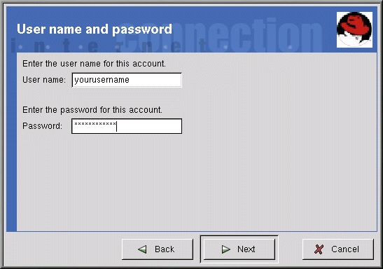 Im nun folgenden Dialogfeld mit der Bezeichnung User name and password müssen Sie Ihren Benutzernamen und Ihr Passwort für die Anmeldung bei Ihrem ISP angeben. Ihr Passwort wird in Form einer Reihe von Sternchen auf dem Bildschirm angezeigt (siehe Abbildung 6-6).