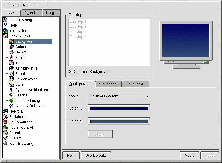 Die Kategorie Background im KDE-Kontrollzentrum emöglicht es Ihnen, verschiedene Hintergründe für jeden Desktop zu wählen. Wenn das Kontrollkästchen Common Background im Gruppenfeld Desktop deaktiviert ist, werden die Bezeichnungen aller Ihrer Desktops verdeutlicht. Wenn das Kontrollkästchen Common Background hingegen aktiviert ist, werden alle Einstellungen für den Hintergrund auf alle Desktops übertragen. Sie können beide Farben und/oder Hintergrundbilder für die verschiedenen Desktops festlegen, solange das Kontrollkästchen Common Background deaktiviert ist.