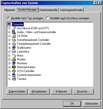 Klicken Sie auf Geräte-Manager. Es erscheint eine grafische Darstellung der Hardware-Konfiguration Ihres Computers. Stellen Sie sicher, dass das Optionsfeld Geräte nach Typ anzeigen aktiviert ist.