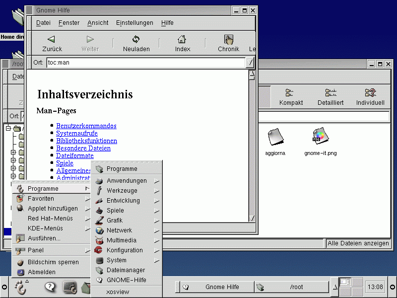 GNOME ist eine leistungsfähige grafische Benutzeroberfläche. Sie umfasst ein Panel (zum Starten von Anwendungen und Anzeigen von Statusmeldungen), einen Desktop (auf dem Daten und Anwendungssymbole abgelegt werden können), mehrere Windowmanager (mit denen das "Look and Feel" Ihres Ihres Desktops eingestellt werden kann) sowie eine Reihe von grundlegenden Desktop-Tools und Anwendungen.