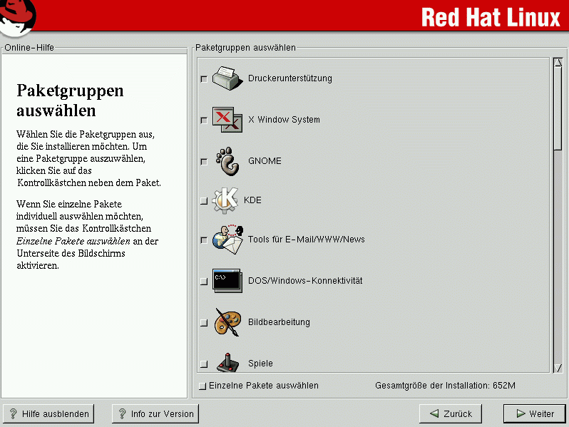 Einige Pakete (wie zum Beispiel der Kernel und bestimmte Bibliotheken) sind für jedes Red Hat Linux System erforderlich und können nicht selektiert oder deselektiert werden. Diese Pakete sind bereits standardmäßig ausgewählt. |