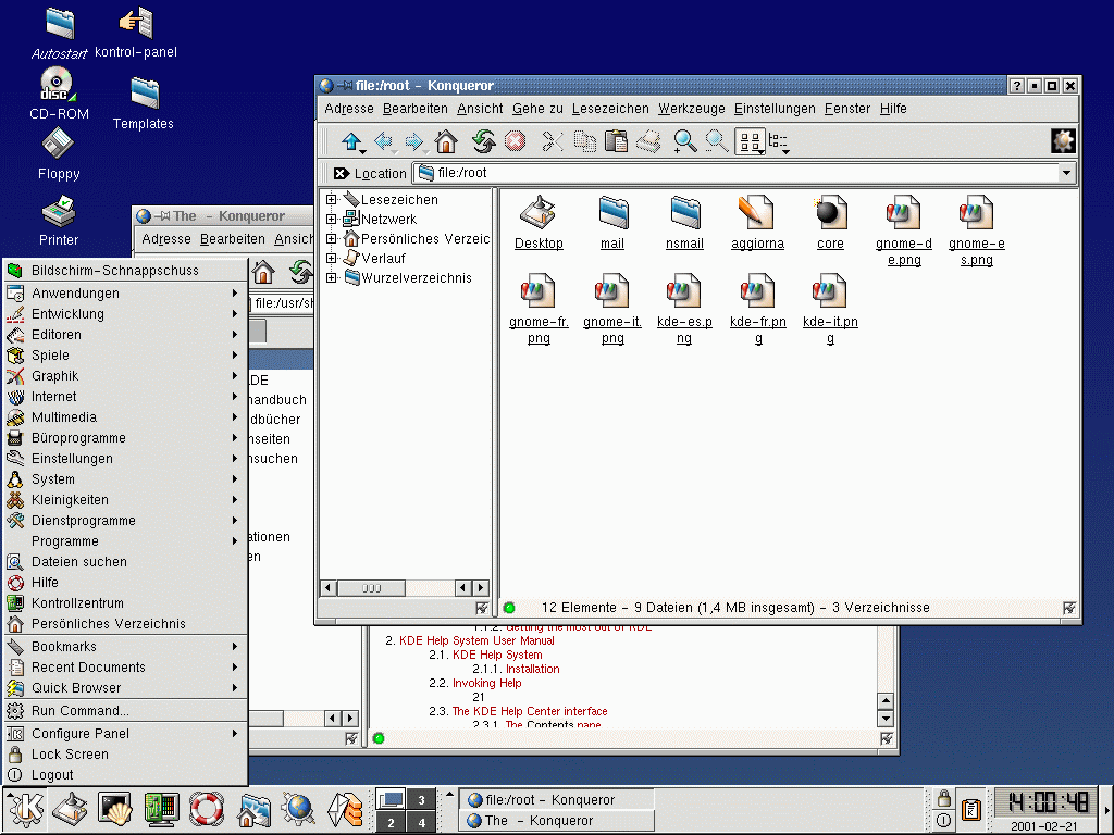 KDE bietet Ihnen einen zeitgemäßen Desktop, ein Hilfesystem mit Suchfunktion, mit dem Sie sich rasch mit dem KDE-Desktop und dessen Anwendungen vertraut machen werden, standardisierte Menüs und Symbolleisten, Tastenbindungen, Farbschemata und vieles mehr.