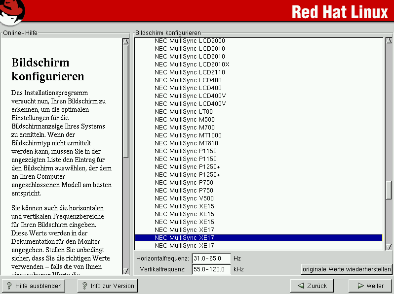 In diesem Bildschirm werden auch die horizontalen und vertikalen Bildwiederholraten angezeigt, die Xconfigurator für Ihren Monitor vorschlägt.