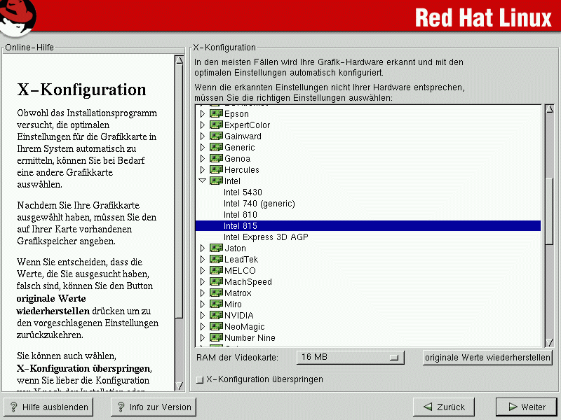 Wenn Sie die Pakete für das X Window System installieren möchten, haben Sie jetzt die Gelegenheit, einen X-Server für das System zu konfigurieren. Wenn Sie die Pakete für das X Window System nicht installieren wollen, gehen Sie direkt über auf Abschnitt namens Installieren der Pakete.
