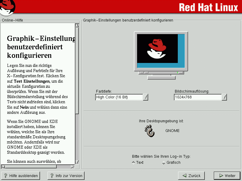 Sie können weiterhin entscheiden, ob Sie das System in eine textbasierte oder eine grafische Benutzeroberfläche booten möchten, nachdem Sie Red Hat Linux installiert haben. Wenn Sie keine besonderen Erfordernisse haben, wird die grafische Benutzeroberfläche (ähnlich wie Windows) empfohlen. Wenn Sie sich für die textbasierte Benutzeroberfläche entscheiden, erscheint ein Prompt (ähnlich wie DOS).