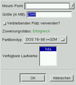 Sobald die gewünschte Partition hervorgehoben wird, klicken Sie auf Bearbeiten. Daraufhin wird ein neues Dialogfeld angezeigt, in dem Sie dieser Partition einen Namen zuweisen können (siehe Abbildung B-2). Im Feld Mount-Point benennen Sie diese Partition als / (also als Root-Partition) und klicken dann auf OK.