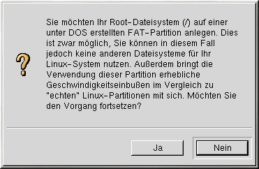 Daraufhin wird ein Dialogfeld (siehe Abbildung B-3) angezeigt, in dem Sie bestätigen müssen, dass Sie mit dieser Installation fortfahren möchten. Sie werden zudem darüber informiert, dass Sie außer der gerade in Ihrer DOS-Partition angelegten "Root-Partition" (/) keine weiteren Linux-Partitionen erstellen können. Klicken Sie auf Ja , um fortzufahren.