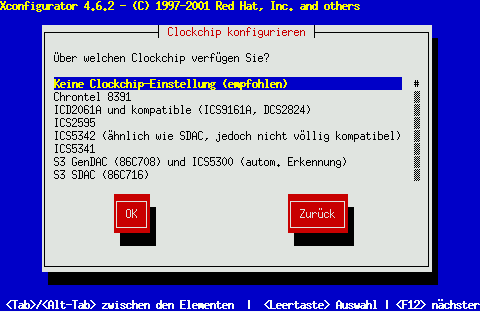 Wählen Sie anschließend eine Clockchip-Einstellung für Ihre Grafikkarte aus (falls Ihre Grafikkarte über einen Clockchip verfügt). Für die meisten Grafikkarten wird die Einstellung Keine Clockchip-Einstellung empfohlen, da XFree86 den richtigen Clockchip in den meisten Fällen automatisch erkennt.