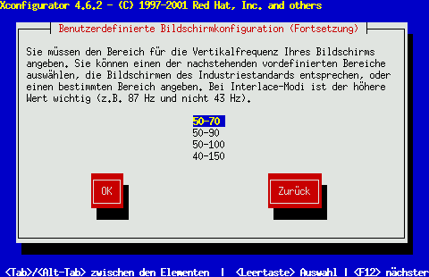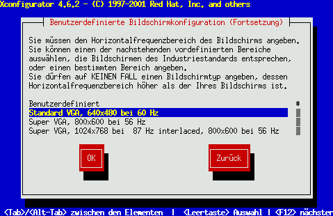 Wenn Sie Benutzerdefiniert auswählen, fordert Xconfigurator Sie auf, den Horizontalfrequenzbereich und die Bildwiederholrate Ihres Bildschirms auszuwählen. (Diese Informationen können Sie normalerweise der Dokumentation zu Ihrem Bildschirm entnehmen, Sie können sie aber auch vom Händler oder Hersteller des Bildschirms beziehen.)