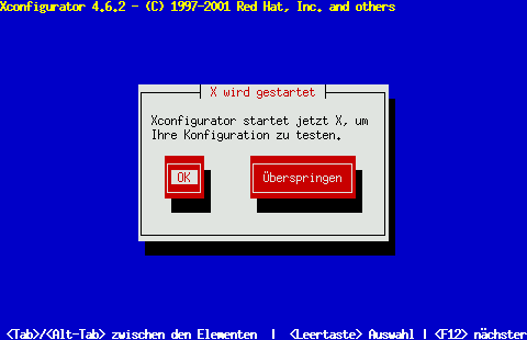 Wenn Sie OK wählen, können Sie zurückgehen und bei möglicherweise auftretenden Fehlern abweichende Werte für die Konfiguration eingeben. Wird kein Fehler erkannt, wird X gestartet, und Sie werden in einem kleinen Dialogfeld gefragt, ob Sie die Anzeige auf dem Bildschirm klar erkennen können. Klicken Sie innerhalb von 10 Sekunden mit der Maus auf Ja. Sie werden dann gefragt, ob Sie beim Booten des Systems X starten möchten.