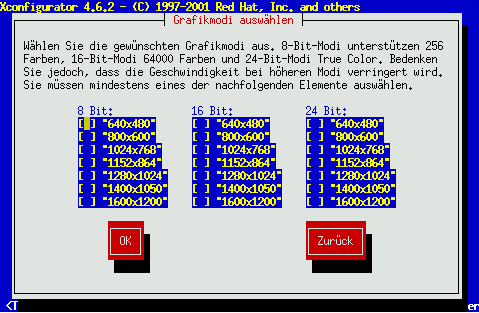 Xconfigurator speichert anschließend alle Einstellungen in den Konfigurationsdateien /etc/X11/ XF86Config oder /etc/X11/XF86Config-4. Um Ihre X-Konfiguration nach der Installation zu ändern, geben Sie den Befehl Xconfigurator als Benutzer root ein.