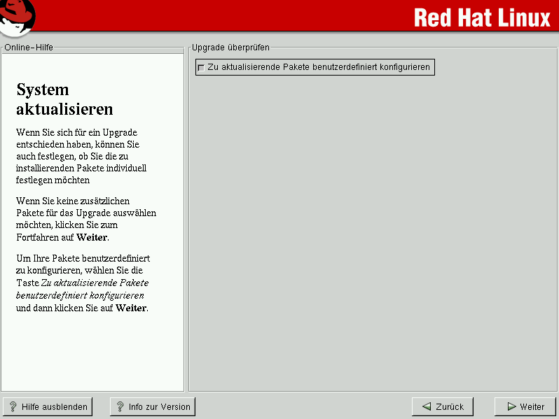 Wenn das Installationsprogramm mit dem Aktualisieren Ihres Systems beginnen soll, darf das Kontrollkästchen Zu aktualisierende Pakete konfigurieren nicht aktiviert sein. Drücken Sie dann die Schaltfläche Weiter (siehe Abschnitt namens Aktualisieren von Paketen).