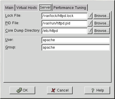 La linguetta Server vi permette di configurare parametri basilari per il server. I parametri di default per queste opzioni sono corretti per molte situazioni.