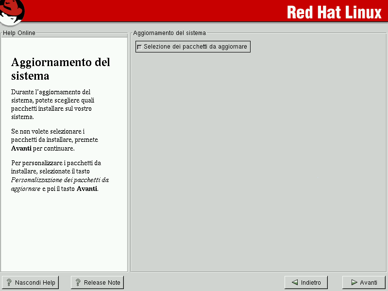 L'utente deve scegliere se lasciare al programma di installazione il compito di aggiornare il sistema oppure procedere di persona all'aggiornamento e alla selezione dei pacchetti da aggiornare (vedere la Figura A-2).