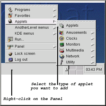 Klicken Sie mit der rechten Maustaste auf Panel und wählen Sie dann Panel => Add to panel => Applets und wählen Sie ein Applet aus der Liste aus (siehe Abbildung 2-6).