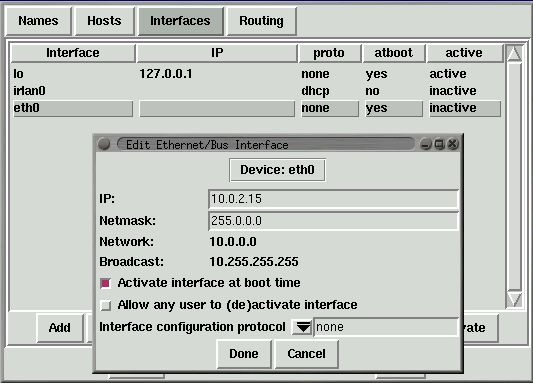 After providing the configuration information for your new device, click Done. The device should appear in your Interfaces list as an inactive device. (The active column should have a label of no.) To activate the new device, first select it with a mouse click and then choose on the Activate button. If it does not come up properly, you may need to reconfigure it by choosing Edit.