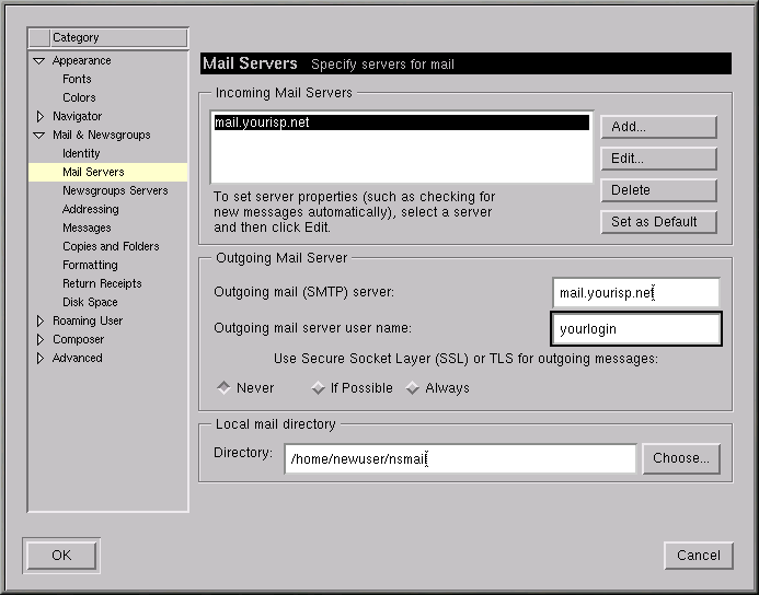 You can specify where you want your mail to be stored by either typing in the location in Local mail directory, or by clicking on the Choose button, and selecting a directory in the navigation window which opens. By default, mail will be stored in a directory in your user directory; if your name is newuser, for example, the path to the directory will be /home/newuser/nsmail.