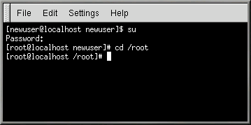 [newuser@localhost newuser]$ su Password: your root password [root@localhost newuser]# cd /root [root@localhost /root]# |