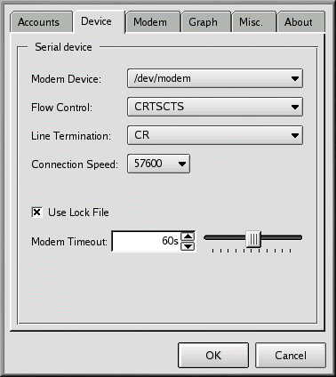 La siguiente entrada, Line Termination, le permite especificar una configuración correcta para su módem. A menudo la entrada CR/LF es la adecuada para la mayoría de los módem. Si tiene dificultades para comunicarse con su módem (vea la la sección de nombre Comprobar su módem), aquí podría regresar para ajustar la configuración.