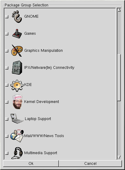 Click the Packages button to configure which packages to install. This section allows you to choose which packages you want to install. These are the same packages groups that are in the Red Hat Linux installation program.