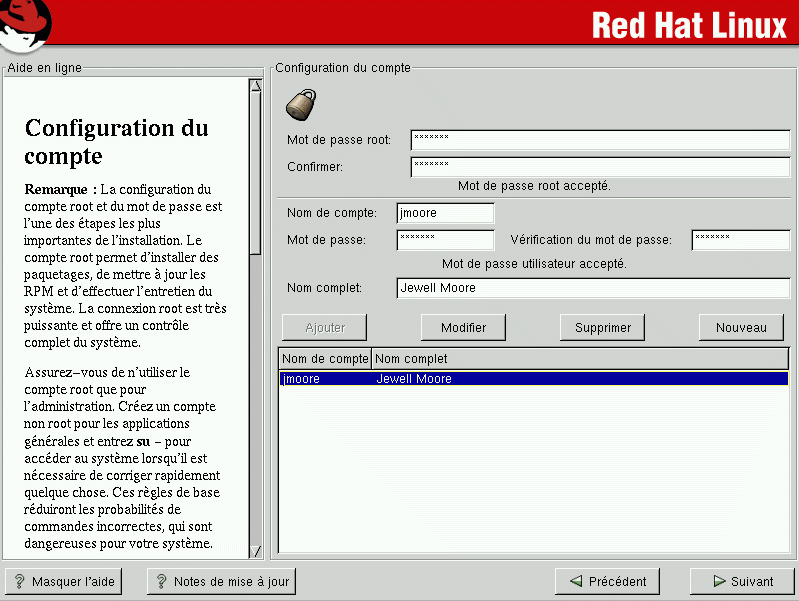 Le mot de passe root doit compter au moins six caractères ; le mot de passe que vous entrez ne s'inscrit pas à l'écran. Entrez le mot de passe deux fois ; si les deux mots de passe entrés ne correspondent pas, le programme d'installation vous invite à recommencer.