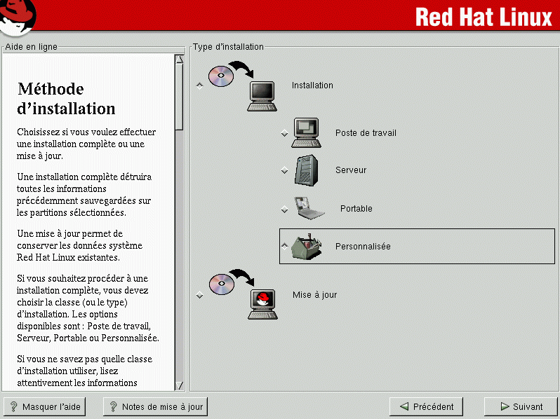 Red Hat Linux vous permet de sélectionner le type d'installation qui répond le mieux à vos besoins. Les installations disponibles sont : Poste de travail, Serveur, Portable, Personnalisée ou Mise à jour.
