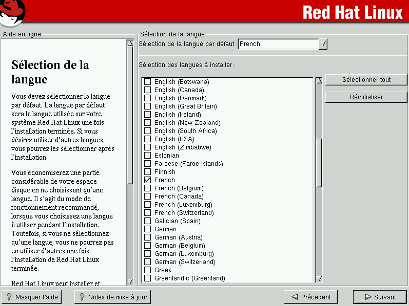 Red Hat Linux peut installer et prendre en charge alternativement plusieurs langues. Choisissez les langues que vous désirez installer ou sélectionnez-les toutes pour pouvoir toutes les utiliser sur votre système Red Hat Linux.