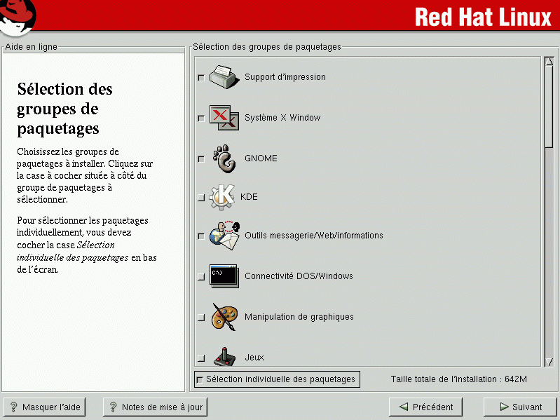 Sélectionnez chaque composant que vous désirez installer. En choisissant Tout (à la fin de la liste de composants) lors d'une installation personnalisée, vous installerez tous les paquetages inclus dans Red Hat Linux. Pour installer tous les paquetages, vous nécessitez de 1,7 Go d'espace libre.
