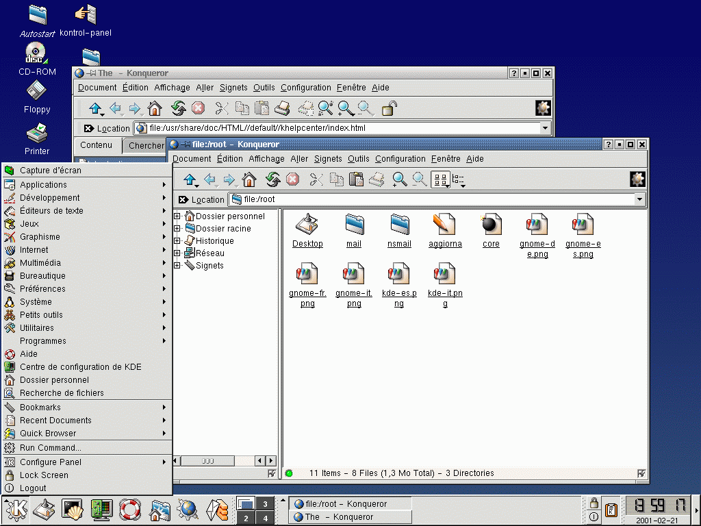 KDE est un environnement de bureau complet comprenant un gestionnaire de fichiers, un gestionnaire de fenêtres, un système d'aide intégré, un système de configuration, divers outils et utilitaires, sans oublier un nombre sans cesse croissant d'applications.