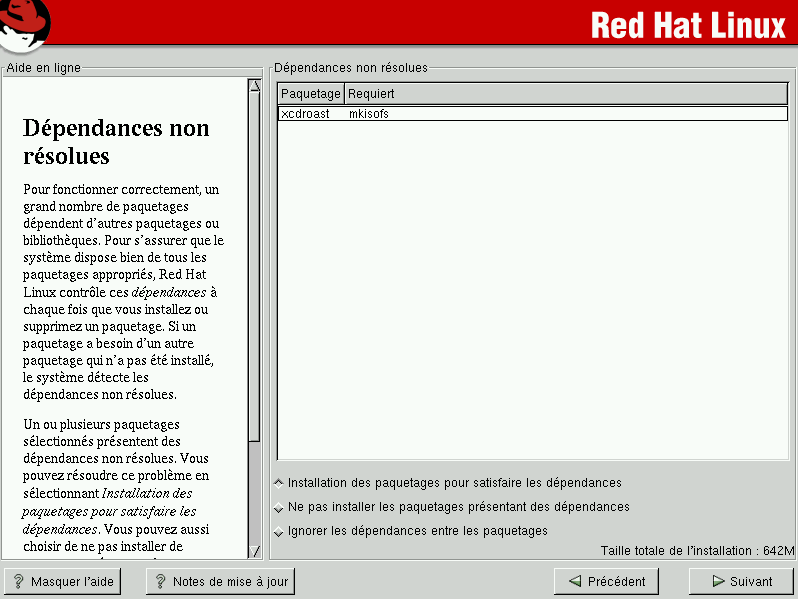 L'écran Dépendances non résolues s'affiche seulement si vous oubliez des paquetages requis par les paquetages que vous avez sélectionnés. Au bas de l'écran, sous la liste des paquetages manquants, la case à cocher Installation des paquetages pour satisfaire les dépendances est sélectionnée par défaut. Si vous la laissez sélectionnée, le programme d'installation résoudra automatiquement les dépendances des paquetages en ajoutant tous les paquetages requis à la liste des paquetages sélectionnés.