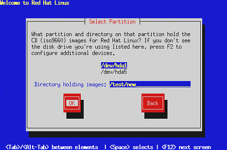 Entrez le nom de périphérique de la partition qui contient les images ISO Red Hat. Il y a aussi un champ appelé Répertoire contenant les images. Si les images ISO ne sont pas dans le répertoire racine de cette partition, entrez le chemin d'accès des images ISO (exemple : si les images ISO sont dans /test/new/RedHat, vous devriez écrire /test/new).