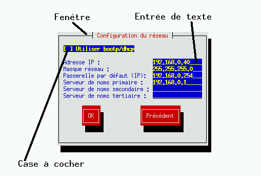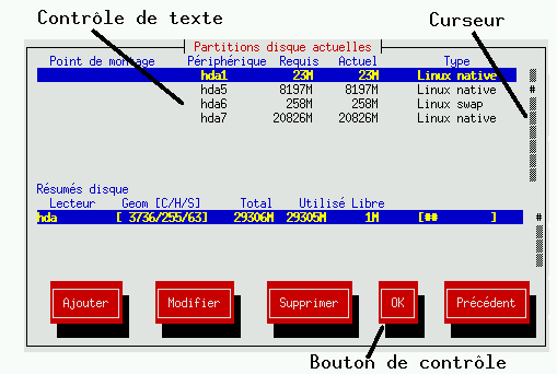 Le programme d'installation en mode texte de Red Hat Linux utilise une interface fondée sur l'écran qui inclut la plupart des contrôles que l'on trouve normalement sur les interfaces utilisateur graphiques. La Figure 5-3 et la Figure 5-4 illustrent les écrans que vous verrez.