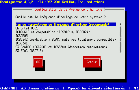 Ensuite, choisissez un paramètre de fréquence d'horloge si votre carte vidéo le permet (si elle en a une). Il est recommandé de choisir Pas de paramétrage de fréquence d'horloge, puisque XFree86 est généralement en mesure de détecter automatiquement la fréquence d'horloge.