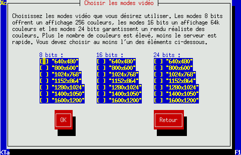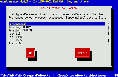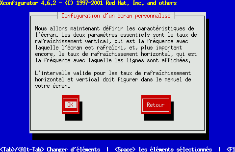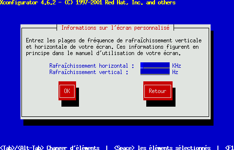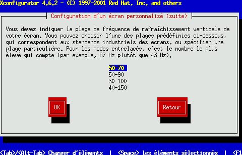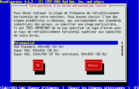 Si vous sélectionnez Personnaliser, Xconfigurator vous invite à choisir les plages de fréquences verticale et horizontale de votre moniteur (ces données sont généralement disponibles dans la documentation qui accompagne votre moniteur ou auprès de son revendeur ou fabricant).