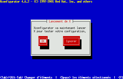 Xconfigurator enregistre ensuite toutes les valeurs choisies dans le fichier de configuration /etc/X11/XF86Config ou /etc/X11/XF86Config-4. Pour modifier votre configuration X Window après l'installation, entrez la commande Xconfigurator en tant que root.