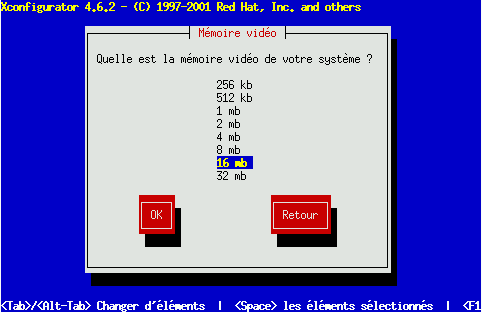 Si vous n'êtes pas certain de la quantité de mémoire de votre carte vidéo, consultez la documentation qui l'accompagne. Si vous choisissez une quantité de mémoire supérieure à la quantité réelle de la carte vidéo, vous ne l'endommagerez pas, mais cela pourrait faire démarrer le serveur XFree86 de façon incorrecte.