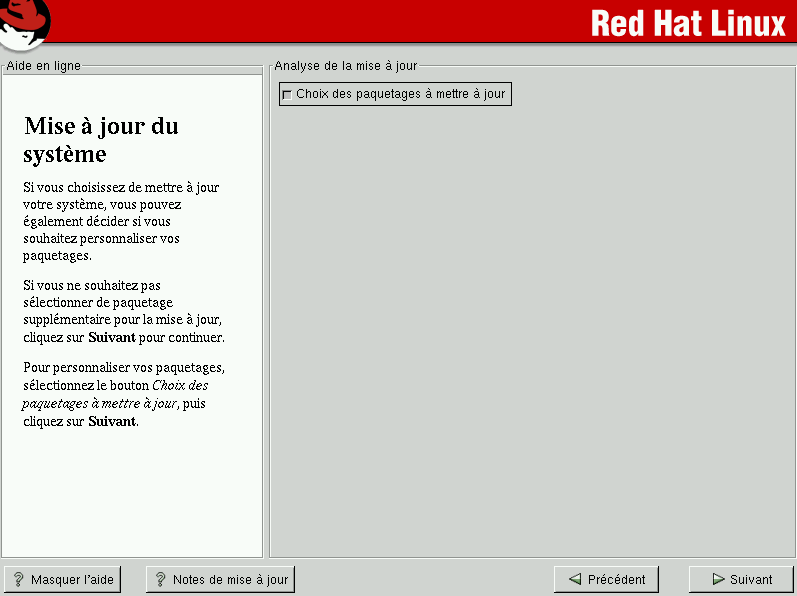 Pour permettre au programme d'installation de lancer automatiquement la mise à jour, assurez-vous que la case Choix des paquetages à mettre à jour n'est pas cochée, puis cliquez sur Suivant (voir la la section intitulée Mise à jour des paquetages).
