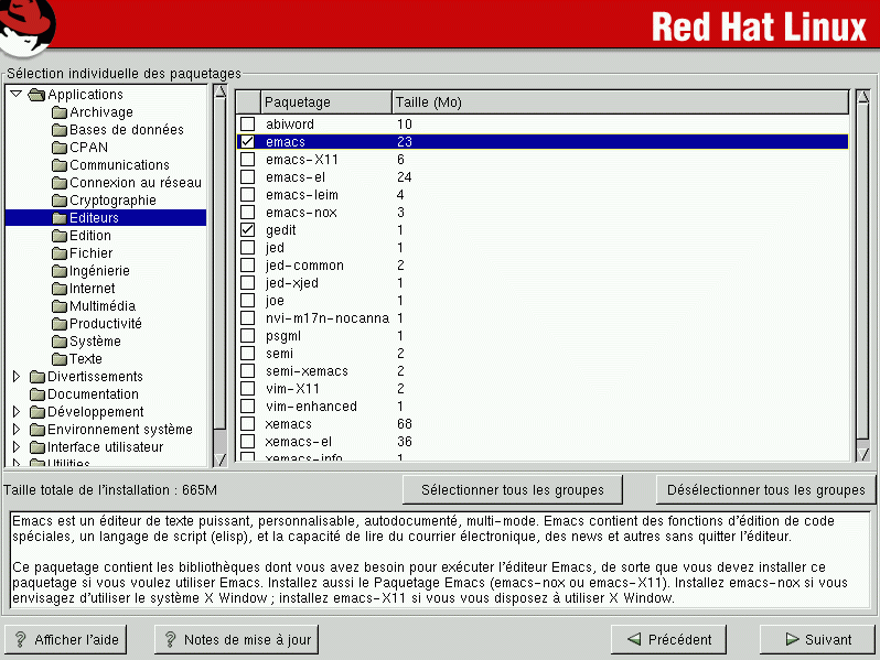 Le système affiche la liste des différents groupes de paquetages dans la partie gauche de l'écran. Lorsque vous développez cette liste (double-cliquez sur un groupe de paquetages, par ex. Applications, pour le sélectionner), et vous double-cliquez sur un répertoire pour le sélectionner, la liste des paquetages pouvant être installés s'affiche à droite.