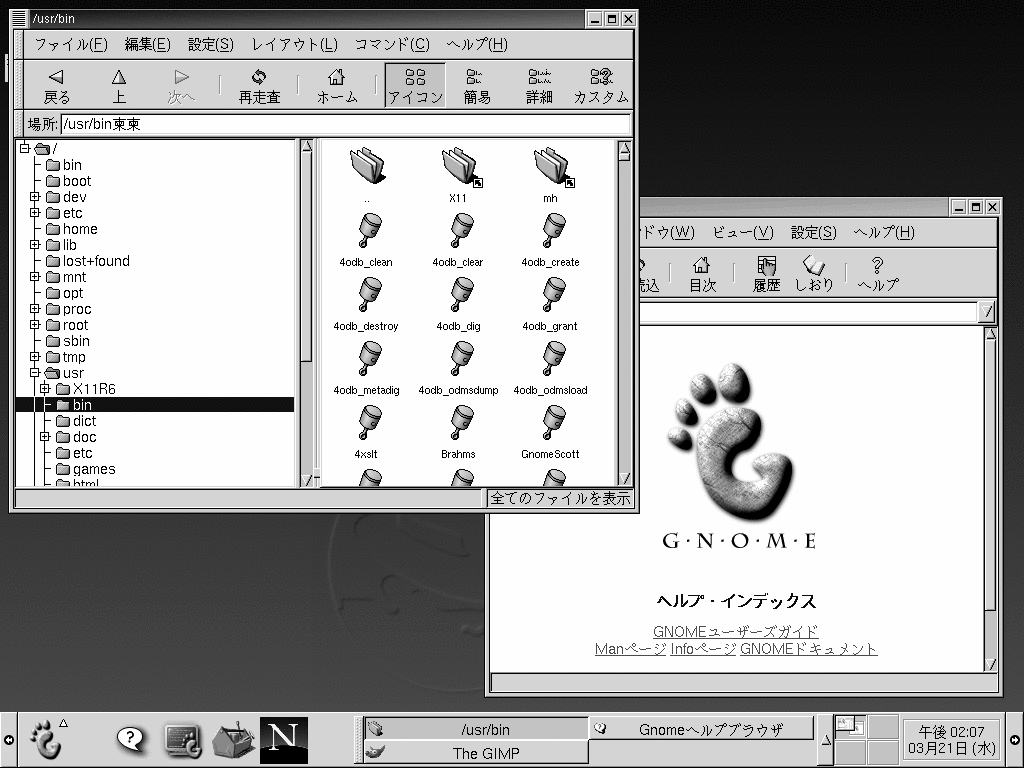 GNOME は、グラフィック操作による強力なデスクトップ環境です。GNOMEには、パネル (アプリケーションの起動やステータスの表示に使用)、デスクトップ(データやアプリケーションの配置)、 複数のウィンドウマネジャ(デスクトップの外観とフィールを決める)、標準的なデスクトップツールセットと アプリケーションセットが含まれています。