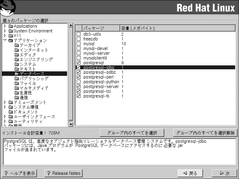 機能別にグループパッケージしてあるコンポーネント(例えば、C 開発、 ネットワーク付きワークステーション、Webサーバ など)や、個別パッケージ、又は それら2つの組み合わせなどを選択することができます。