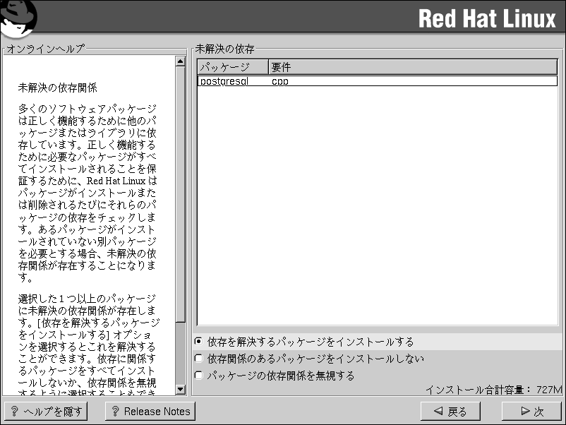 未解決の依存関係の画面は 選択したパッケージによって 必要としているパッケージがない場合にのみ表示されます。 画面下部の不足しているパッケージのリストの下に、依存を解決する パッケージをインストールするというチェックボタンがデフォルトで選択されています。 チェックがある状態のままでいると、インストールプログラムは選択されたパッケージのリストへ 全ての必要なパッケージを追加することによって、自動的にパッケージの依存関係を解決します。