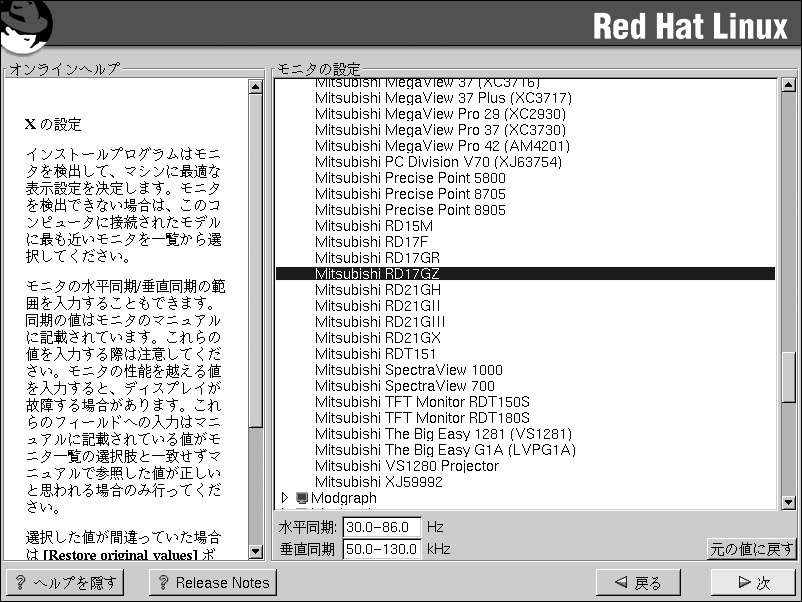 使用しているモニタが一覧にない場合は、Genericモデルの 中から、最も適切と思われるものを選択します。Genericモニタを選択すると Xconfiguratorが水平同期と垂直同期の範囲を提案してきます。 これらの値は、通常モニタに付属している説明書から、又は、モニタの販売元か製造元から入手できます。 モニタの説明書で、これらの値が正しく設定されているかどうかチェックして下さい。