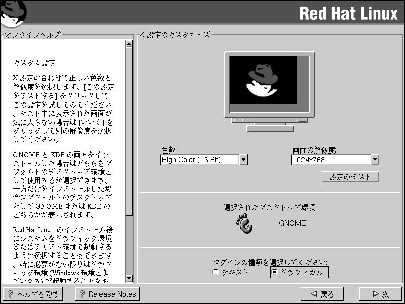 Xの設定に合わせて適正なカラー設定と解像度を選択します。設定のテスト ボタンをクリックしてこの設定をテストします。テスト中の表示が満足できるものでない場合は、 いいえボタンをクリックして、別の解像度を選択します。