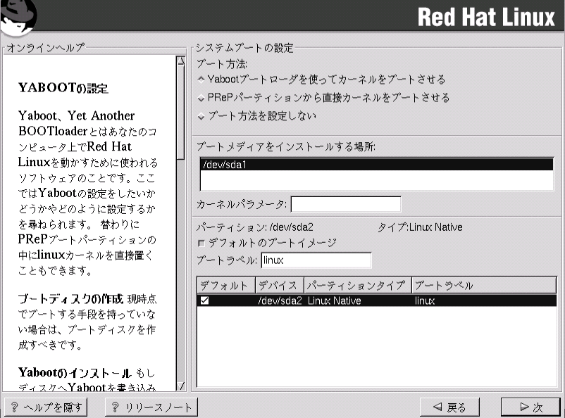 YABOOTの代わりに使用 — ブートディスクはYABOOTの代わりに使用することが出来ます。 Red Hat Linuxを初めて試していて、他のオペレーティングシステムのブートプロセスを変更したくない 場合は、YABOOTの代わりに使用することが出来ます。ブートディスクを使うと、ブートディスクを 取り出して再起動するだけで、簡単に他のオペレーティングシステムに戻ることが出来ます。 YABOOTの代わりにブートディスクを使用する場合は、YABOOTをインストールする オプションが選択されていないことを確認してください。