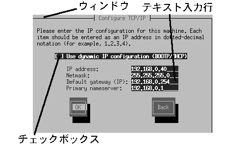 ウィンドウ — ウィンドウ(通常、このマニュアルの中では、 ダイアログボックスと呼ばれます。)はインストールプロセス中ずっと、画面に 出て来ます。時として、一つのウィンドウが他のウィンドウの上に重なることがありますが そんなときは一番表面のウィンドウが操作可能です。表面のウィンドウを終了すれば、 消えますので、その裏にあったウィンドウを操作できます。