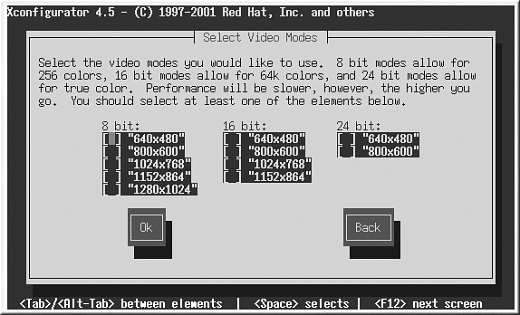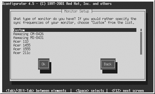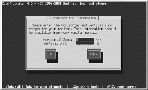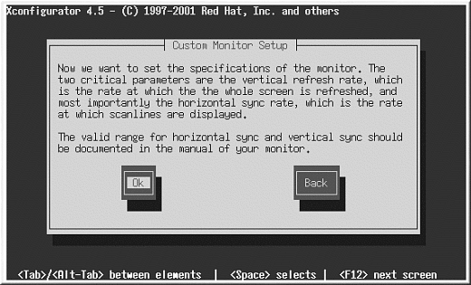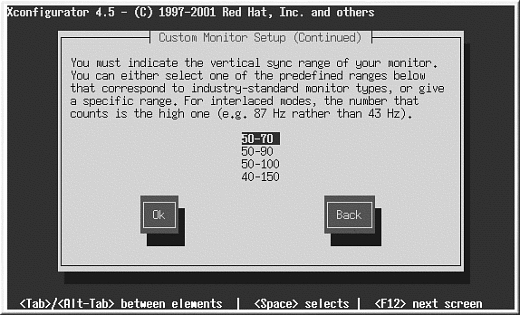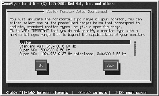 カスタムを選択した場合、Xconfiguratorは 使用しているモニタの水平同期と垂直同期の範囲を選択するように指示します(通常、これらの値はモニタに 付属する取扱説明書に記載されています。説明書が手元になければ、モニタのベンダーやメーカーから必要な 情報を入手することができます)。